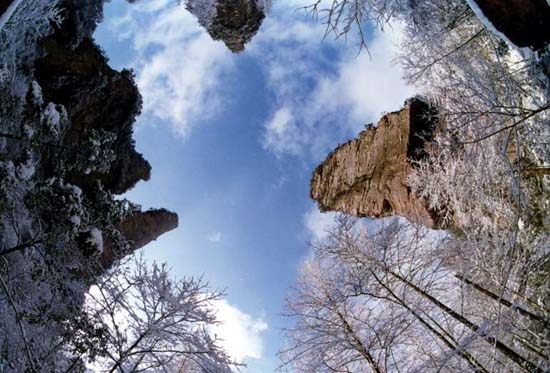张家界国家森林公园位于湖南省西北部张家界市境内,是1982年由国务院委托国家计委批准成立的中国第一个国家森林公园,1992年12月因奇特的石英砂岩大峰林被联合国列入《世界自然遗产名录》,2004年2月被列入世界地质公园。公园自然风光以峰称奇、以谷显幽、以林见秀。其间有奇峰3000多座,这些石峰如人如兽、如器如物,形象逼真,气势壮观。峰间峡谷,溪流潺潺,浓荫蔽日。有“三千奇峰,八百秀水”之美称。公园不仅自然风光壮美绝伦,而且森林植物和野生动物资源极为丰富,森林覆盖率达98%,是一座巨大的生物宝库和天然氧吧,被称为“自然博物馆和天然植物园”。草木禽兽与奇山异水,同生共荣,形成完美的自然生态系统。