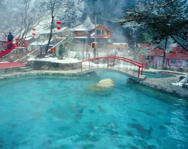 该温泉水温52℃,日流量在1500吨以上,含理、锶、氟、锌、硼、晒、锗等17种有益人体的微量元素,是目前四川省唯一的集浴用、饮用、疗用为一体的天然热矿泉,对人体消化系统疾病、风湿病、皮肤病、胆结石、胆囊炎等均有较好的疗效,具有美容、护肤、减肥、延年益寿等功能,1994年被评为四川省优质名泉。